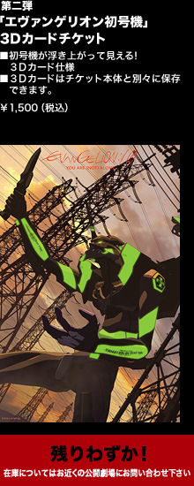 さらに完全数量限定特別鑑賞券の第2弾の「エヴァ初号機3Dカードチケット」も売り切れ間近です!『ヱヴァンゲリヲン新劇場版:序』公開時のみの限定特別鑑賞券をコンプリートする最後のチャンス!