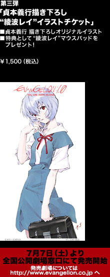 7月7日(土)より全国の公開劇場にて発売となる完全数量限定特別鑑賞券第三弾は、エヴァンゲリオンで主・キャラクターデザインをつとめる貞本義行が描木下ろした”綾波レイ”イラストを券面にデザインしたチケットですが、特典も同じく貞本義行描く下ろしの「”綾波レイ”マウスパッド」に決定しました。